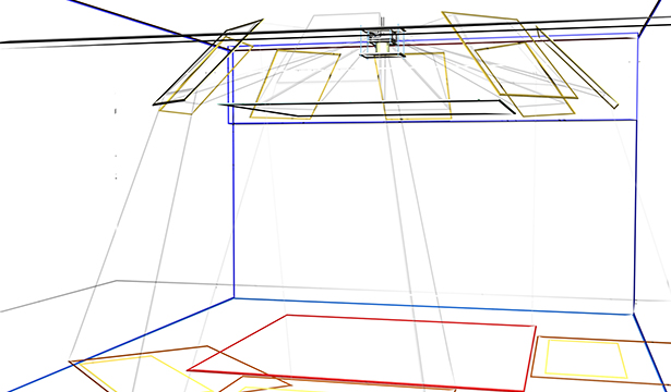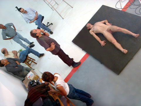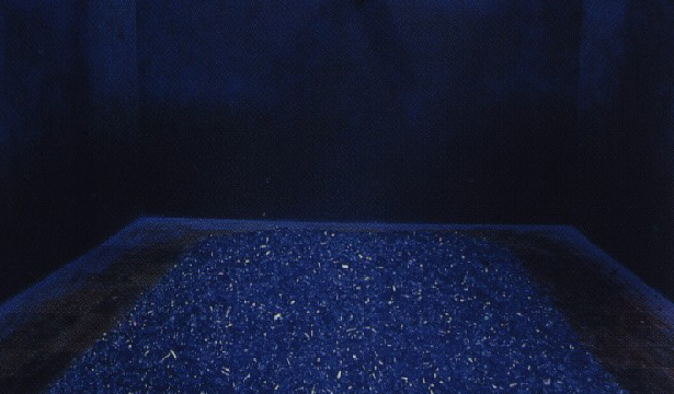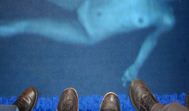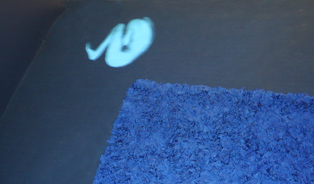 The installation is set up in a half-open space, as if it were a town square, where there could be a lot of people moving around, but that is not well-lit. In the center of the space there is a large heavy totally handmade blue rug, like those made by prisoners' wives. The series of images as well as the spots onto which they are projected occur in a random way. Once a person steps onto the rug two things happen: an image of a nude body is projected onto the ground and a strong wind is created by a fan from a wall facing the spectator. The only noise is that of the wind from the fan which creates tension and instability. As for the images, from the moment that they are projected onto a given spot tension zones are generated tension with the result that the actions of the bodies react when the spectators get closer and when they move away. When the spectators reach the bodies the situation becomes irreversible with the death of the characters and the disappearance of the images. An interval without any projections or actions follows.