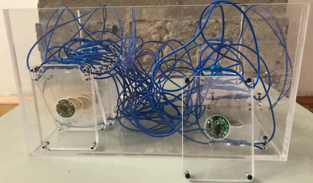 While entering, at the side of the circuit printed on the wall the visitor will have access to a sensor-necklace equipped with beacon (small device that emits Bluetooth signal), which will capture part of his/her tour, to be pointed out to the other visitors in a map shown at the exhibition exit, as mark of their presence and circulation.